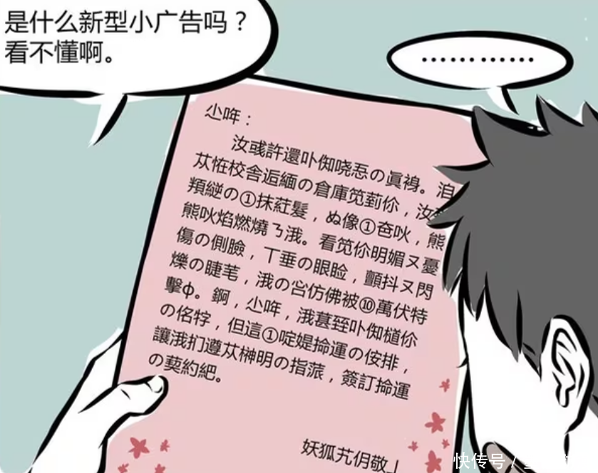 哮天并不知谈这是九月给他的情书,只以为是什么新式小告白,他看不懂上头的火星文。其实九月是约了哮天在校舍背面的仓库碰面,背面即是一些比拟中二的情话,还暗示这是红运的安排,还让哮天听从神明的指派,坚决红运的公约。九月倒是有写上我方的名字,然而哮天看不懂,那背面的事情就没观念发生。