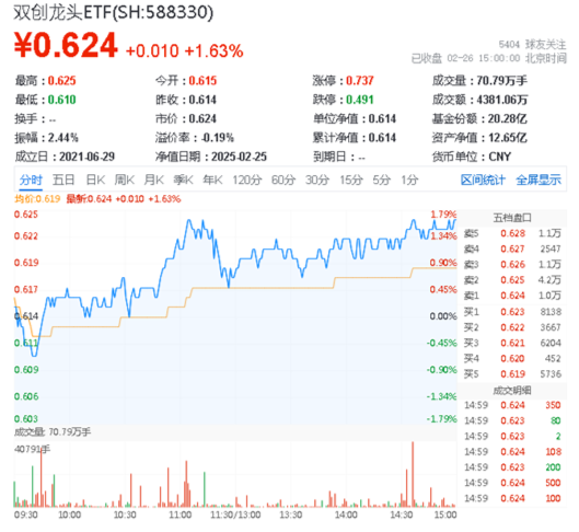 本日,成长作风弘扬解析占优,科创50涨逾2%,创业板指涨超1.2%,消灭科创板+创业板高成长龙头的双创龙头ETF(588330)场内价钱劲涨1.63%,全天成交额达4381.06万元,交投较为活跃。