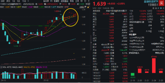 热门ETF方面,行情急时尚——金融科技ETF(159851)尾盘强势走高,场内价钱收涨2.05%,日线斩获六连阳!全天换手率超14%,成交额达7.4亿元,环比放量解析!
