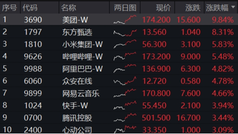 科网龙头强势领涨,好意思团-W收涨9.84%;小米集团-W涨5.83%,股价站上56港元,再立异高;哔哩哔哩-W涨超5%,阿里巴巴-W涨超4%,腾讯控股、快手-W涨逾3%。