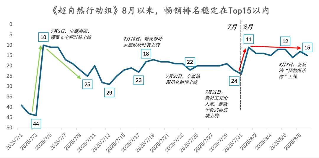 巨东谈主收罗 《超天然》8月排行健硕在Top15以内,高频行径运营才调强。
