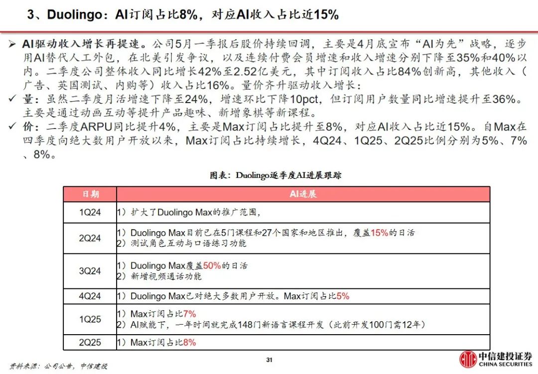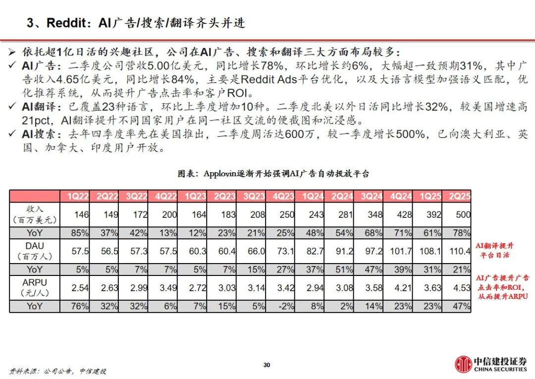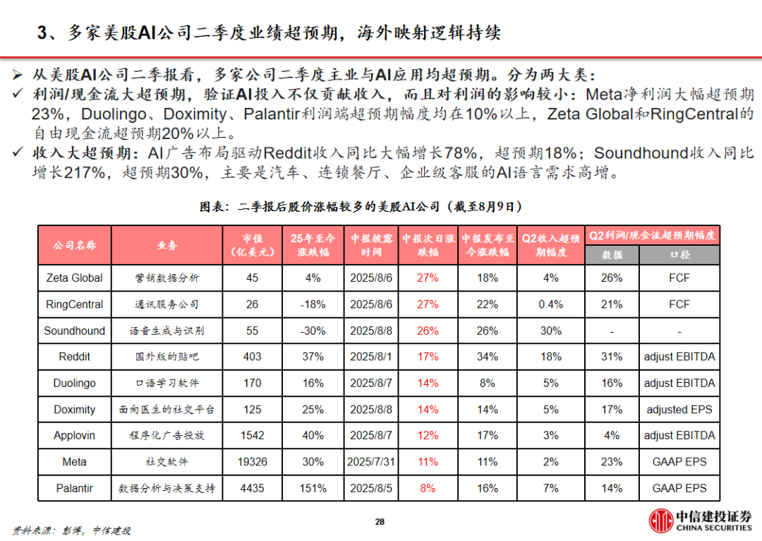 本周多家好意思股AI诈欺公司二季报超预期,国外映射逻辑捏续。Applovin天然二季度事迹和三季度诱骗超预期的幅度均在5%以内,但AI告白自动投放和素材创作加速落地,有望成为公司新的利润增长点。Reddit的AI告白布局,驱动公司二季度营收5.00亿好意思元,同比增长78%,环比增长约6%,大幅超一致预期31%。Soundhound二季度收入大超市集预期30%,收入完全值与同比增速均创新高,主若是汽车、零卖、餐饮等规模的AI语音需求捏续高增。Duolingo、Doximity、Palantir利润端超预期幅度均在10%以上。