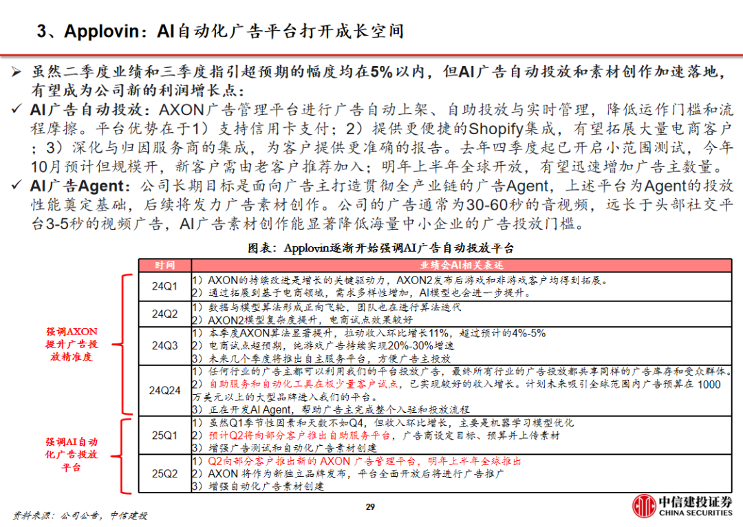 易点六合:已接入GPT-5系列模子。8月8日,OpenAI发布GPT-5,公司已全面接入,上线AI Hub中台并诈欺于旗下AI居品矩阵,将赋能公司AI+营销居品矩阵。结合国外Meta(困难的出海营销媒体平台)等科技巨头Q2出色的告白业务事迹,公司出海营销业务有望受益。8月8日,applovon发布二季度事迹,净利润略超预期,游戏告白仍是驱动applovin事迹增长的主要驱动,AXON 2.0起到困难推动,applovin盘算本年10月敞开AXON并同步粉饰主要国际市集,26年上半年运行付费营销获客,applovin事迹印证了AI对门径化告白的赋能,此外公司与applovin在大中华区的电商行业拓展达成合作,关注后续进展。