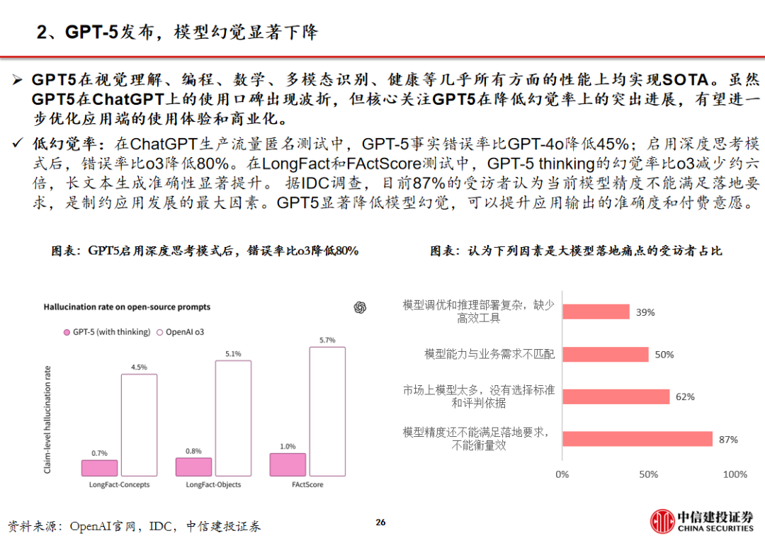 GPT5大幅裁汰模子幻觉率,有望提高下流诈欺的准确度和用户付费意愿,加速诈欺生意化。GPT5在视觉交融、编程、数学、多模态识别、健康等险些通盘方面的性能上均实现SOTA,中枢关注GPT5在裁汰幻觉率上的杰出进展,有望进一步优化诈欺端的使用体验和生意化。在ChatGPT坐蓐流量匿名测试中,GPT-5事实失误率比GPT-4o裁汰45%;启用深度想考模式后,失误率比o3裁汰80%。在LongFact和FActScore测试中,GPT-5 thinking的幻觉率比o3减少约六倍,长文本生成准确性权臣提高。