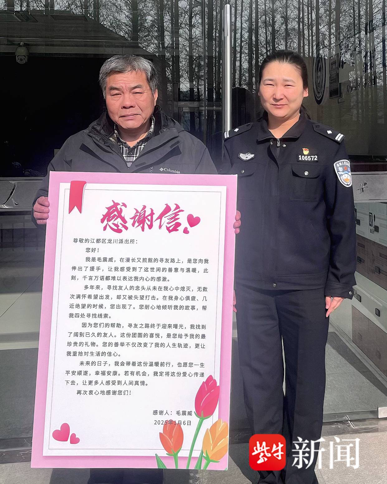 值班民警被这份友情打动,了解基本情况后,立即进行查询,并请来了所里的一位老民警襄助回忆,找到了几位辖区内同名或有相通名字的住户。毛震威认出其中有他要找的东说念主,在民警的热心引导下,今日晚上就见到了几位老一又友。他在信中写说念:“简直感谢龙川派出所,圆了我几十年的心愿!”