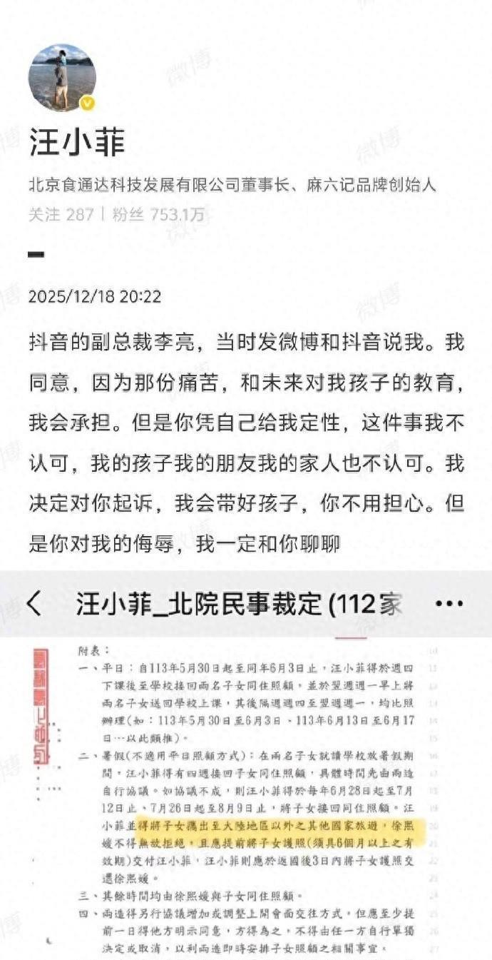 12 月 18 日汪小菲一会儿在外交平台晒出多年前的子女奉养权裁决书,并放狠话要告状抖音副总裁李亮,看似风牛马不相及的操作,实则藏着曩昔思见娃却求而不得的满满委屈!