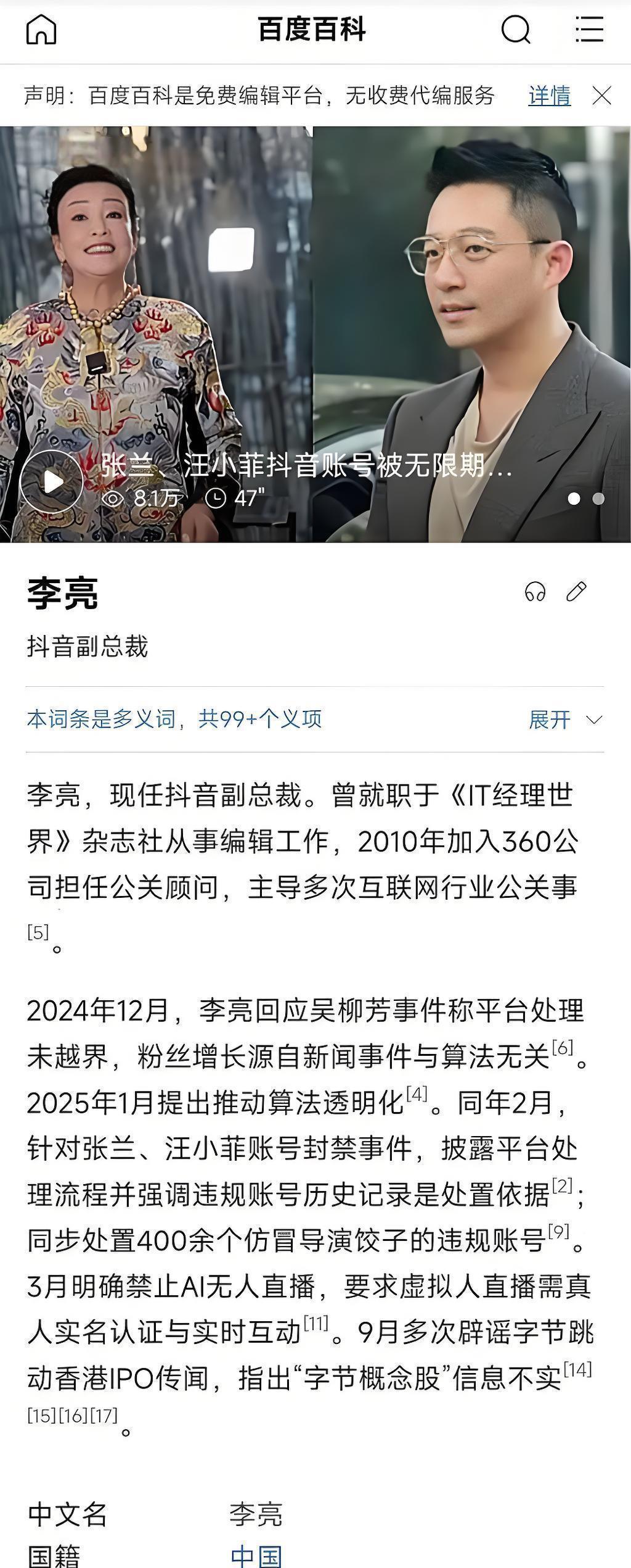 至于汪小菲要告状抖音副总裁李亮,这事还得记忆到本年 2 月。其时抖音以 “应用骸骨坏心炒作” 为由,封禁了汪小菲和张兰的账号,而李亮四肢抖音副总裁,恰是当初修起封禁事宜的认真东说念主。汪小菲当今翻旧账告状,猜想是咽不下账号被封的那语气。
