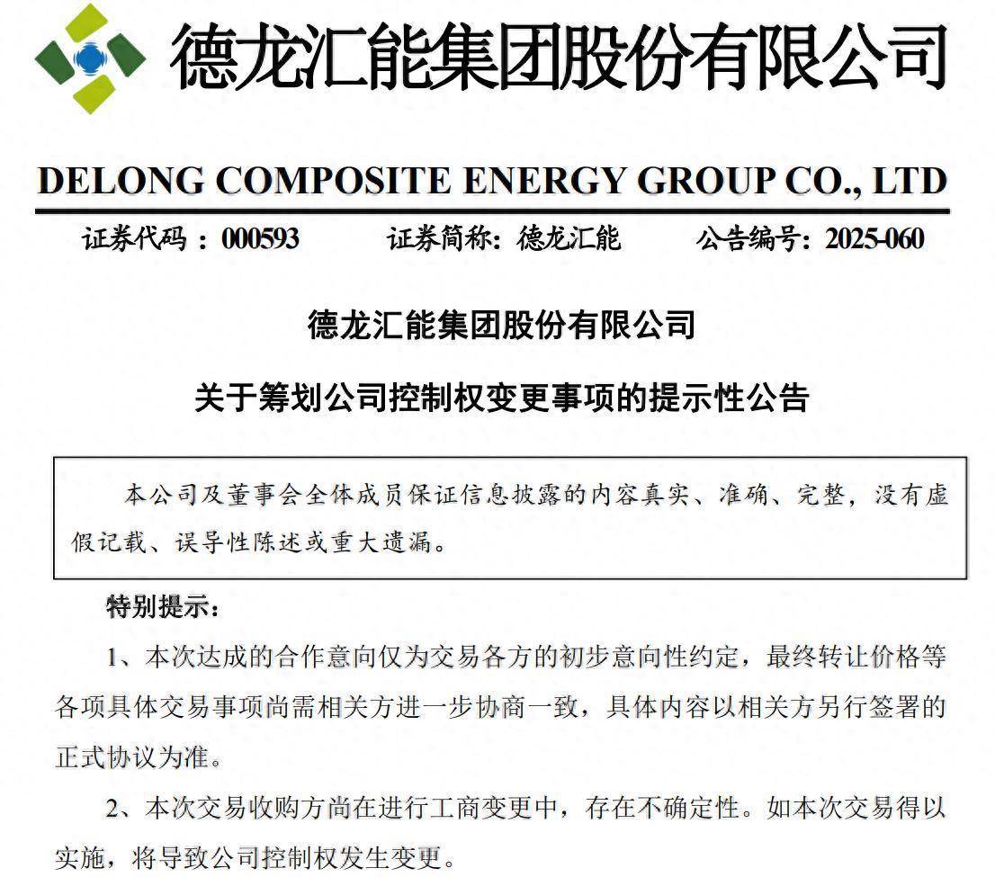 德龙汇能(000593)10月24日晚间公告,公司收到公司控股鼓舞北京顶信瑞通科技发展有限公司的见知,获悉其与东阳诺信芯材企业责罚结伴企业(有限结伴)缔结《股份转让之意向公约》,拟将其捏有公司29.64%股份转让给东阳诺信芯材企业责罚结伴企业(有限结伴),可能导致公司戒指权发生变更。当今,各方主体正在就具体往还决策、公约等有关事项进行讨论,尚存在要紧不细目性,如往还两边不成达成一致,可能存在间隔有筹算的风险。