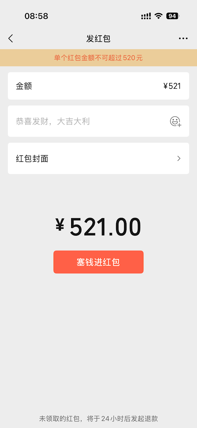 往年在5月20日、七夕等出奇节日,微信也会进行肖似调遣,不外红包额度提高常常仅限今日24小时。