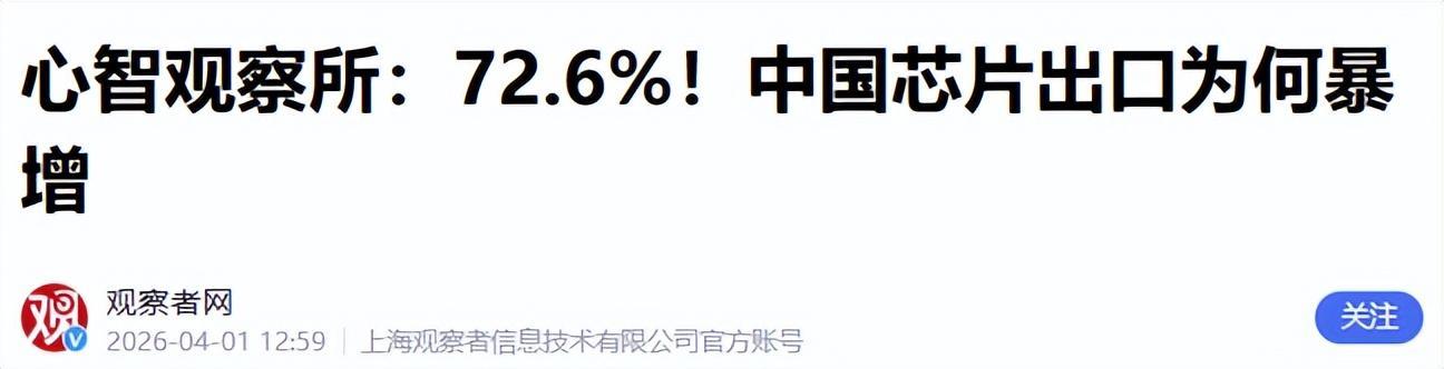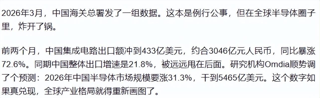 2026年1到2月,中国集成电路出口额高出3000亿元,同比增长72.6%。
