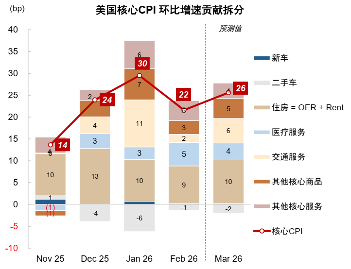 二是房租样本交替的抵偿效应。2025年10-11月好意思国政府停摆,导致10月份房租CPI环比涨幅被记为0。经由6个月后,房租样本再度交替至客岁10月份的样本,样本交替的抵偿效应将导致4月份房租CPI(占比约34%)环比涨幅翻倍,推升当月通胀读数。